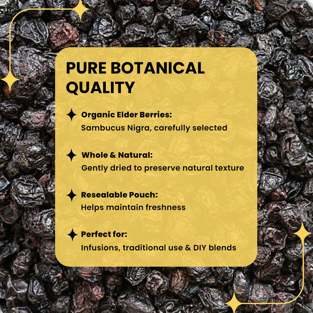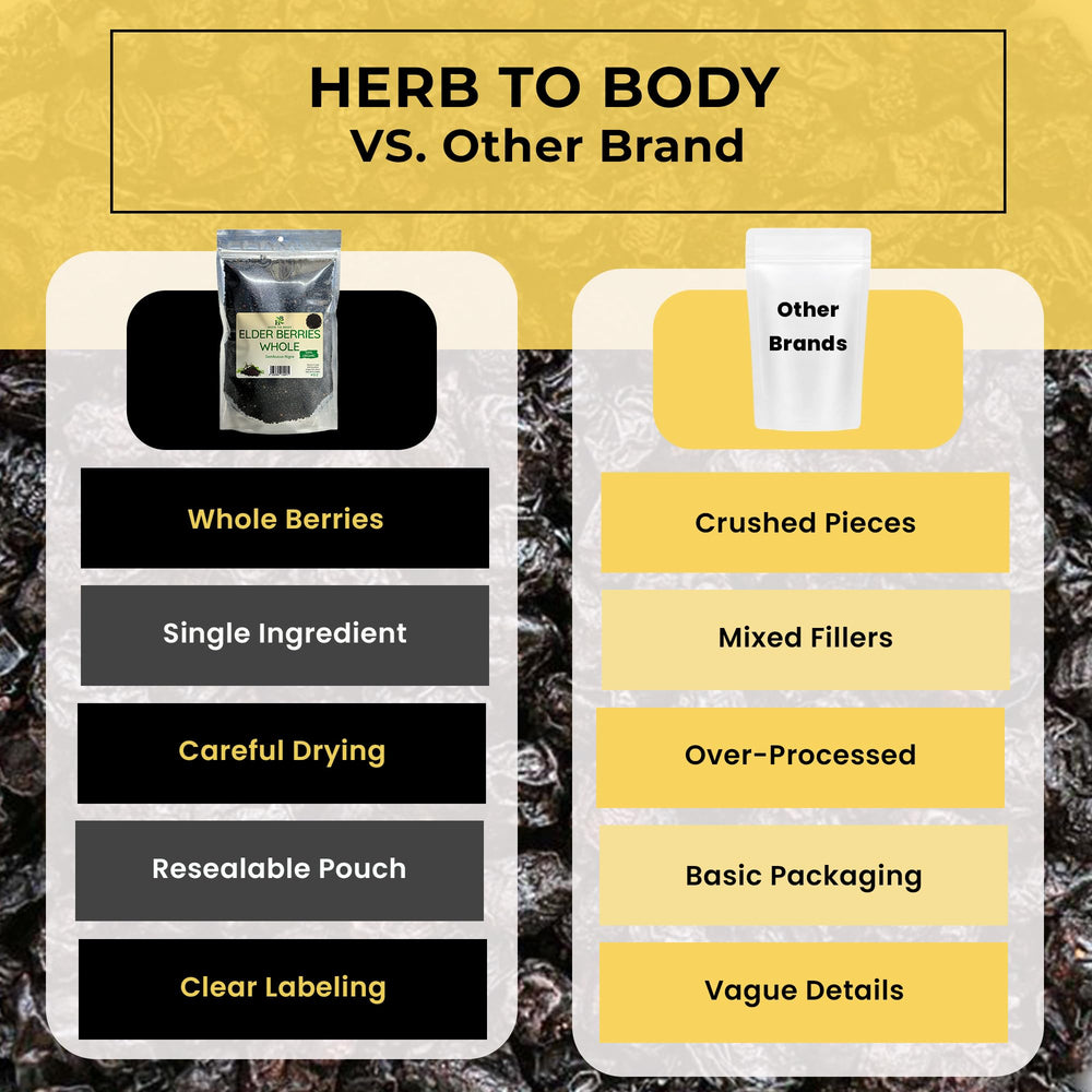 Las bayas de saúco enteras secas de Herb To Body combinan calidad, tradición y facilidad de uso. Este producto se recolecta de forma responsable y se seca para conservar su color intenso y su aroma afrutado. Con 113 g listos para tu despensa, ofrecen una base versátil para diversas preparaciones sin aditivos ni colorantes añadidos.